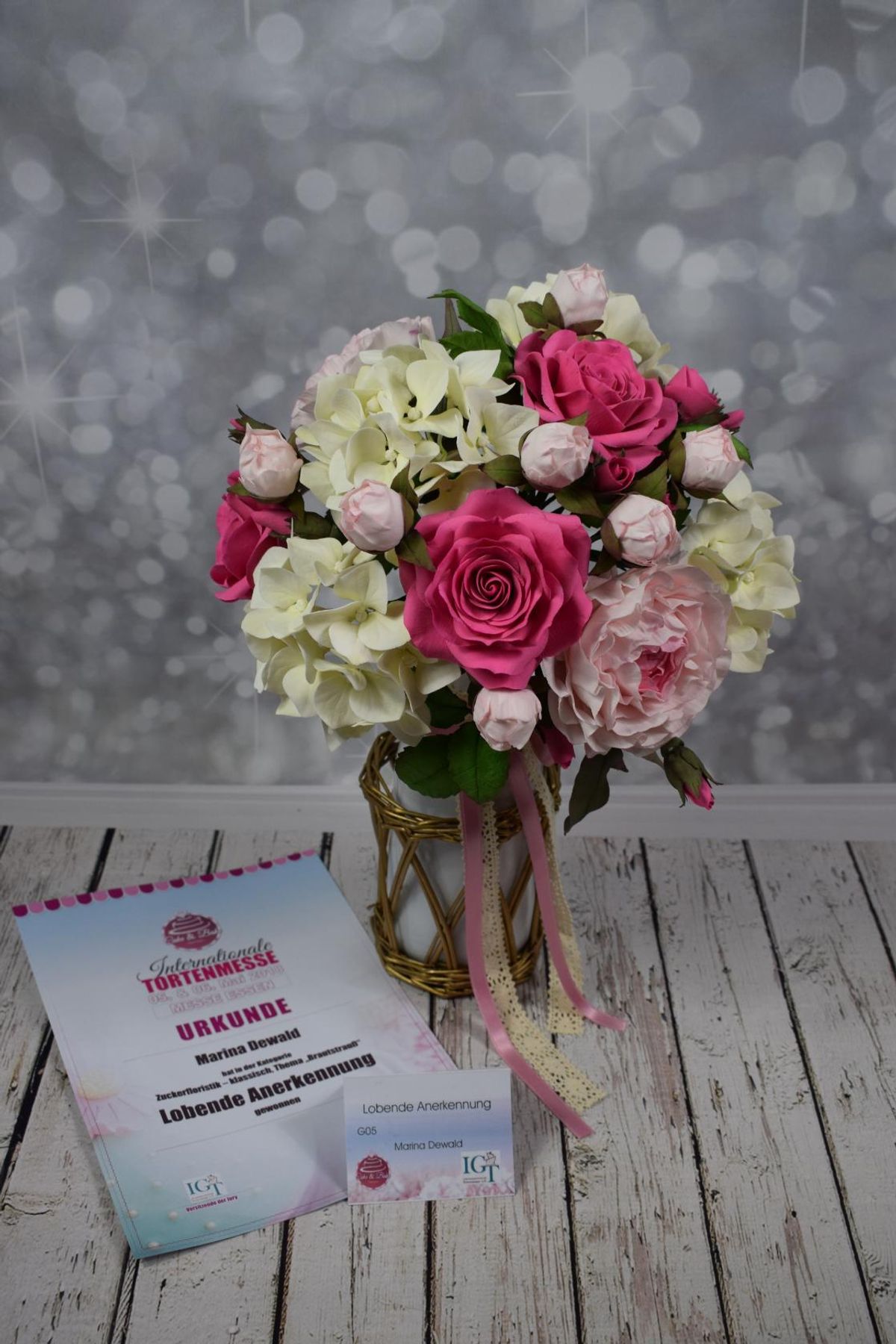 Beschreibung Ich bin Ingrid-Maria Sekljic und wohne in Kapfenberg in Österreich. Meine erste Blume – eine Schneerose – habe ich im Jänner 2015 bei „Gustabene“ in Graz/Tobelbad gemacht. Via „Ellen’s Creative Cakes“ aus Holland bekam ich die Möglichkeit zur Teilnahme an einem workshop mit Alan Dunn. Das hat mich so fasziniert, dass ich noch weitere Kurse u.a. bei Tony Warren, Eugenie Skalosub sowie Katharina Pfaffenrot besucht habe und in den letzten Jahren habe ich mich bei mehreren online-workshops weitergebildet. Auszeichnungen bei Wettbewerben haben mich stets motiviert. Gold – Cake InternationaI Birmingham